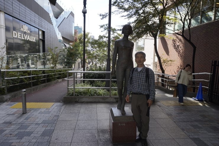 물건들이 제법 무겁다. 신주쿠 거리 도로 위에 놓여진 바위에 앉아 잠시 휴식을 취한다.